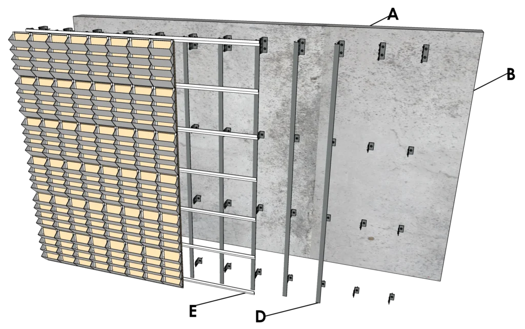 The structure consists of load-bearing brackets, wind brackets, vertical profiles, and horizontal profiles. For attaching the brackets, we use chemical anchors or mechanical anchors depending on the type of substrate. The load-bearing bracket is designed to carry most of the load and is mounted at the very top, followed by the wind brackets mounted below. Vertical “L”-type profiles are attached to the brackets using selfdrilling screws. Horizontal “Z”-type profiles are then mounted to the vertical profiles The modular system is hung on the “Z”-type profiles and secured using selfdrilling screws.
